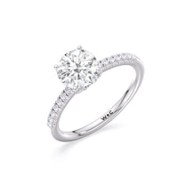This sophisticated engagement ring features our signature arc hidden halo design along with a diamond pave band to highlight the center stone perfectly! A modern take on a classic style.